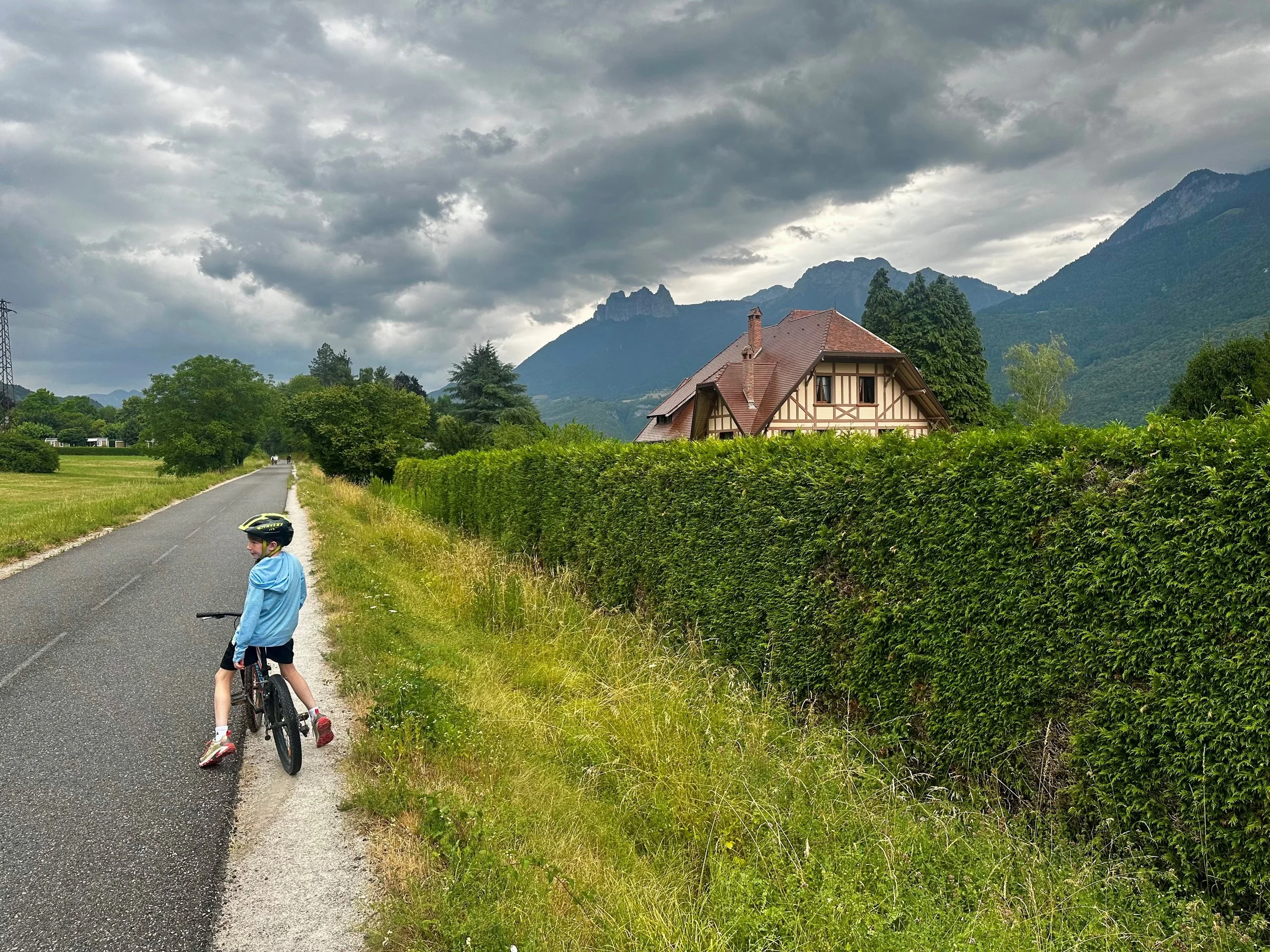 There is a mostly paved cycling trail around Lake Annecy. To bike the entire lake, it is a long loop- around 26 miles (42 km). Most of the route is flat or gently rolling, but the east side north of Talloires has a steeper section up and down the mountain. With kids, we wanted to avoid this part of the trail, so we opted to rent bikes from Nomad Bikes in neighboring Agnon (in a campground), and set out south from Talloires with the aim to make it across the lake to Le Bon Wagon in the town of Duingt. I had heard about this train station that had been converted into a bike shop serving up smoothies, pastries, and poke bowls in Conde Nast Traveler, and it was a nice destination to have. At first, we intended to rent all electric bikes, but the availability was low, so we ended up with regular pedal bikes. The weather looked threatening, and some rain clouds were moving in, but we set out anyway to see how far we could get. The path offered up beautiful views of the lake and the kids really enjoyed it. Well, we didn’t quite make it to Duingt. The skies opened up when we were almost there, but we were forced to pull off for cover in another converted train station café with a bar. We took shelter and ordered some chicken nuggets, croque monsieurs, smoothies and beers and waited out the downpours for a chilly couple of hours. From there we headed back to Talloires, biking around 13 miles in total.